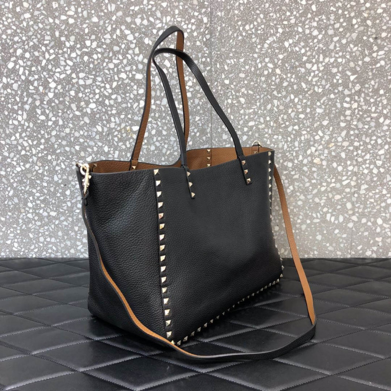 Valentino Garavani Medium Double Rockstud Reversible Tote Bag 0067J Black/Brown Easybags67668 ist eine luxuriöse und vielseitige Handtasche aus hochwertigem genarbtem Leder. Diese Tasche ist ein Must-Have für alle Modebegeisterten und bietet eine stilvolle Option für jeden Anlass.